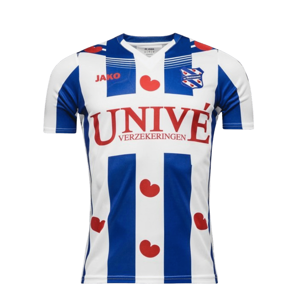 Toon je trots voor sc Heerenveen met het officiële thuisshirt van het seizoen 2015-2016. Het klassieke ontwerp combineert witte en blauwe verticale strepen met de zeven herkenbare rode pompeblêden op de voor- én achterkant. Op de borst prijken het clublogo en het JAKO-logo, terwijl hoofdsponsor Univé Verzekeringen centraal op de voorkant staat.